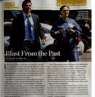 En este sentido, EW, publicó este spoiler: "Después de todas las dificultades que hemos pasado, Bones y Booth consideran necesariamente hacer un cambio en su vida profesional. Consideración que se hace más perentoria cuando el que sospechan que es un imitador del asesino en serie Pelant vuelve a reunir al equipo en lo que parece el final de la serie." Claro que todos sabemos que regresarán para la temporada 11.
